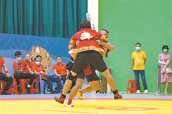 民族式摔跤场上,想要在短时间内将对手摔倒,是十分考验参赛者的力量与技巧的。绊跤(男子62kg)比赛,来自汉族的选手夺得少数民族传统体育运动第一名,成为摔跤比赛的亮点之一。