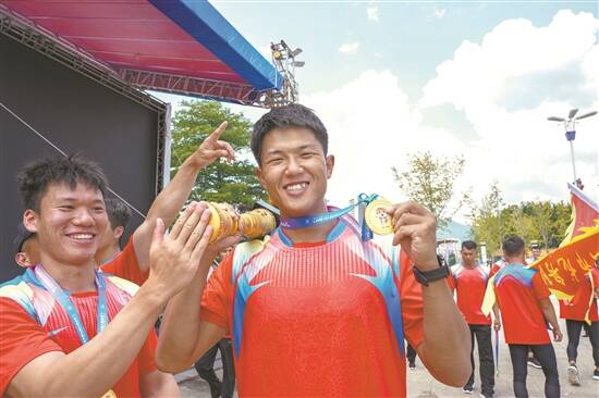 龙舟项目夺冠后,佛山队的小伙子们向记者展示金牌和奖杯,脸上难掩兴奋之情