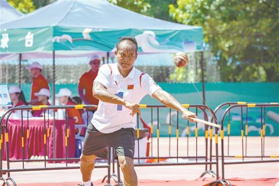 来自深圳队的佤族选手岩帮在陀螺项目中夺得本届运动会首金