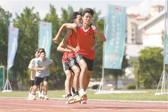 板鞋竞速十分考验团队协作能力。三人一队,步调稍微不统一即可能脱板。有的团队健步如飞,遥遥领先。越过终点线,他们笑得十分开心。