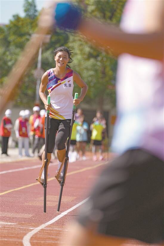 田径场上,有疾速如飞的高脚竞速选手,也有不慎跌倒两次仍坚持完赛的选手。她用行动践行了永不言弃的体育精神。