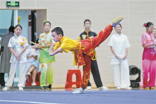 小小年纪和成年人同台竞技却毫不怯场,少林功夫耍得铿锵有力,赢得场下一片掌声
