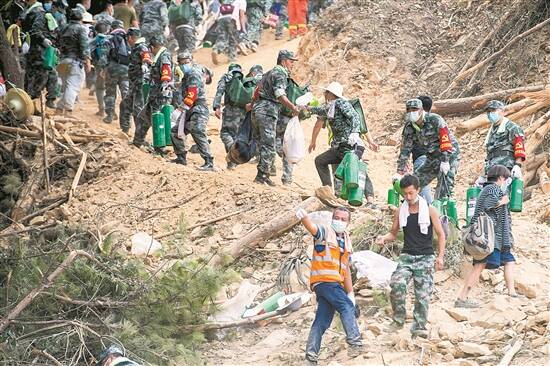 26日,消防、武警等救援力量和志愿者合力运送物资 新华社发