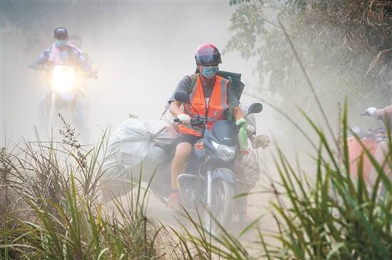 马达轰鸣声中,摩托车一个接一个地呈S形冲上挖掘机开拓出的土坡,又从滚滚尘烟中冲回来。在山脚,越来越多的越野摩托车集结,准备奔赴到这条保障一线扑救人员后勤的生命线上。