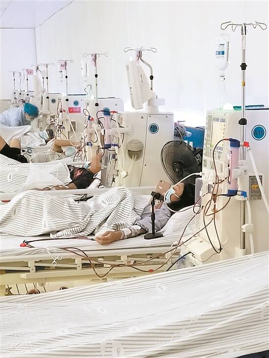 硕大的针头刺入皮肤,随着机器的运作,鲜红的血液被导出体外,一圈圈流转,最终又输回体内,至少持续四个小时。因为身患尿毒症,这样的血液透析过程,周姐每周要经历三次。