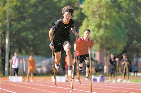 在乳源县高级中学田径赛场上,名为高脚竞速的比赛正在进行,为运动员助威的呐喊声增加了热烈的气氛。