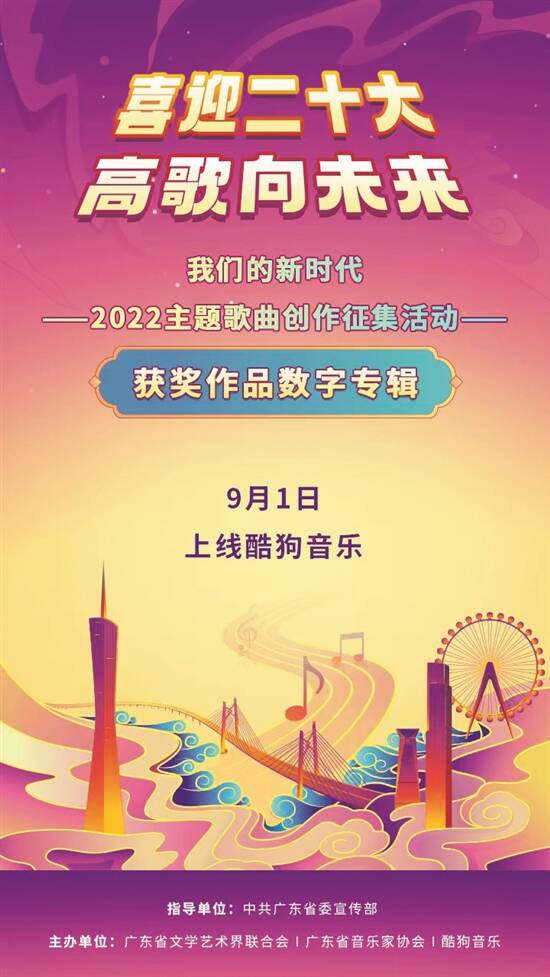 经过四个月的征集和评选,“我们的新时代”2022主题歌曲创作征集活动近日圆满落幕,从11639首投稿作品中评选出30首获奖作品。这30首作品集结成《喜迎二十大 高歌向未来——“我们的新时代”2022主题歌曲创作征集活动获奖作品数字专辑》,目前已正式上线酷狗音乐平台。部分获奖作品将在“我们的新时代”广东省喜迎党的二十大音乐会上作展演。