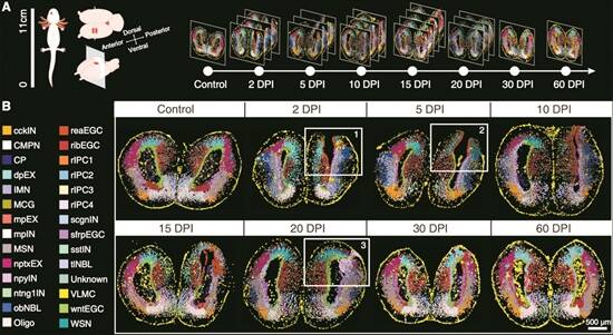 图为蝾螈脑再生时空图谱(图片来源于《科学》杂志)