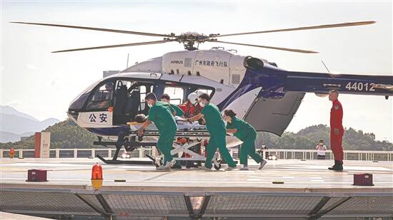 在当天的联合演练中,妇儿中心接通知后第一时间在院内准备好手术室、安排重症监护人员到位,同时,广州市公安局警航支队驾驶直升机前往伤员处转运。