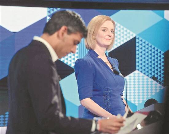 伊丽莎白·特拉斯(右)在英国特伦特河畔斯托克参加电视辩论的资料照片(7月25日摄) 新华社发