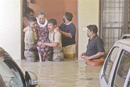 5日,印度班加罗尔消防队员从被洪水淹没的公寓中救出一名老妇 图/人民视觉