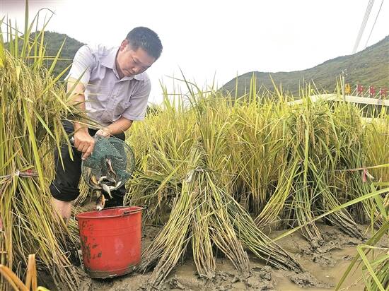村口的农田里,中冲村村民朱炳子在准备排水捕鱼。随着水位下降,一条条饱满圆润、乌里透红的鱼儿显露出身形。他动作迅捷,伸手抓起一条条禾花鱼,装入身旁水桶中。