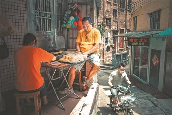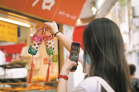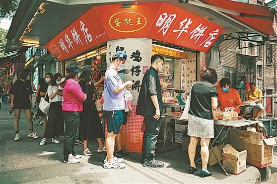 猪笼饼新鲜出炉,排队等候购买的街坊络绎不绝。年轻人买一块猪笼饼,手捧着手机“打卡”,传统广府中秋味在复兴。随着潮流元素更迭,张智华也为猪笼饼添加了更多喜庆元素,比如,将猪笼饼放入色彩丰富的竹篮,系上中国结,附上“家肥屋润”小贴纸,将广府人的中秋情传递至千家万户。