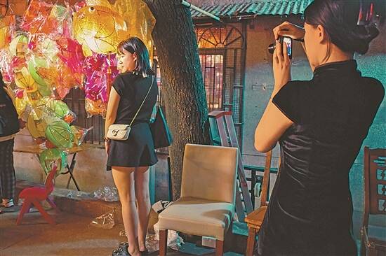 天就行也吸引着年轻人。一位旗袍美女为闺蜜留影