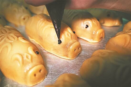 制作一块外形如金猪的猪笼饼十分考究糕饼师傅手艺。张智华介绍,从制皮、包馅、套模、点睛、烘烤、扫蛋酱、二次烘烤,整整需要花费一个多小时。他说:“虽然每天只能出炉400-500块猪笼饼,但手工制作包含着温度和人情味,是机械化生产无法比拟的。”