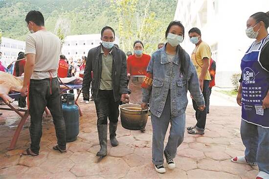 冷碛镇甘露寺村村民把饭菜送到泸定县第二中学安置点 新华社 发