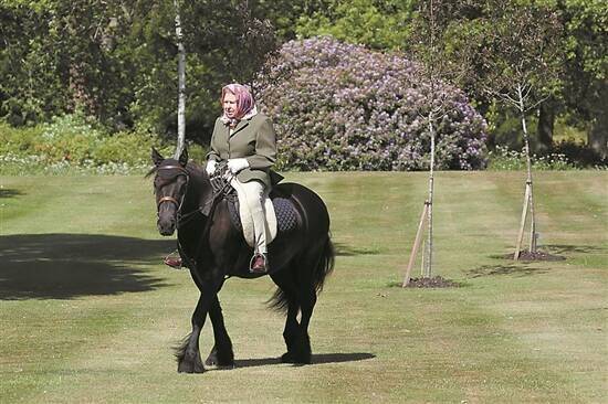 2020年5月31日,英国伦敦,94岁的英女王在公园骑马散步