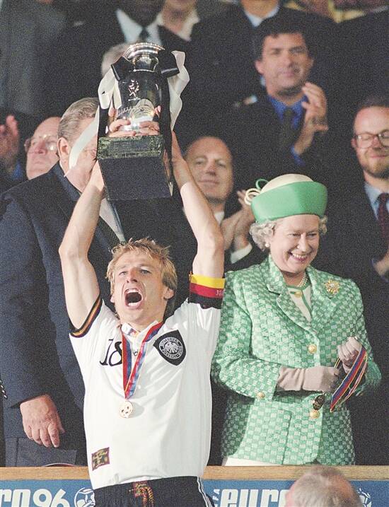 1996年6月30日,英国伦敦,德国队队长克林斯曼在英女王面前捧起欧洲杯冠军奖杯