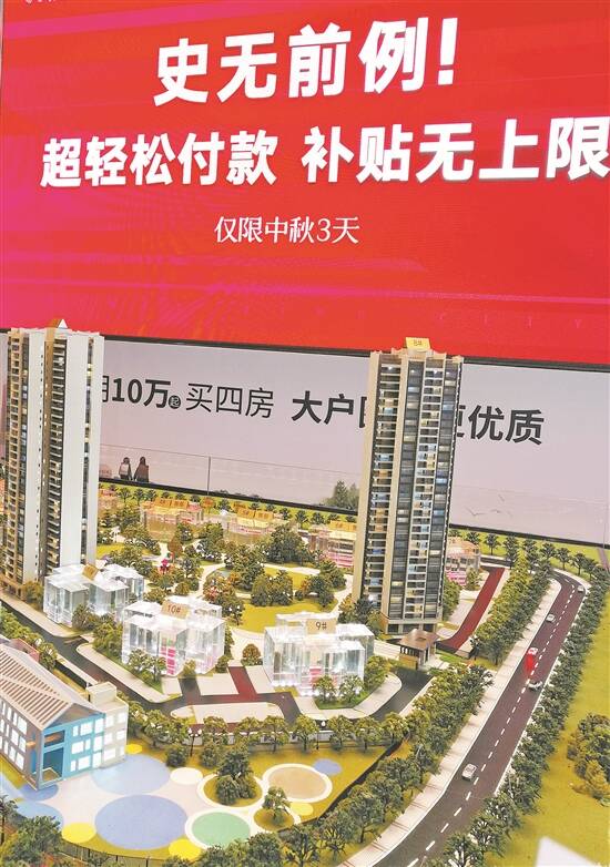 据了解,该楼盘首期于2019年发售,部分楼栋已经交付。中秋节期间促销的是第8栋和第12栋单位。中秋节假期第二天上午,记者所在售楼部的一个小时内,到访的看楼者并不多,其中有三位看楼者告诉记者,他们也是冲着低首付而来。在楼盘沙盘旁边的电子宣传屏上,到访者都能看见反复出现的“史无前例!超轻松付款,补贴无上限”“中秋钜惠,首期2万元起”等促销标语。