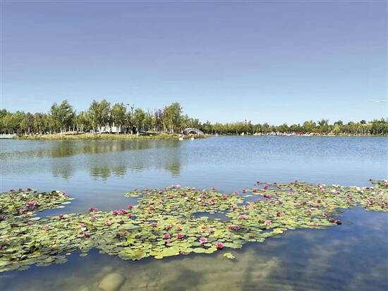 王副校长骄傲地说,别看城市小,我们有29个公园呢。过去是推窗见荒坡,现在出门不远是公园!他带我们来到位于市中心的朱雀湖公园。公园占地230亩,水域90亩,水系与伊犁河湿地相连。湖面上倒映着蓝天白云,浮在水面上的睡莲与岸边的红柳、姹紫嫣红的薰衣草等交相辉映;湖心岛、湖心亭、风景石、石桥、长廊、亲水栈道错落有致;环湖有1.5公里的健康步道,供市民休闲健身。每逢周末,公园还放映水幕电影,那是市民的欢乐时光。公园里游人不算多,有年轻情侣在窃窃私语,有中年男女闲庭信步,有一家老小享天伦之乐,悠哉游哉,一派祥和。阴凉处的空地上,一队披红挂绿的中年妇女在跳广场舞,放的音乐正是那首“东方小夜曲”——《草原之夜》。