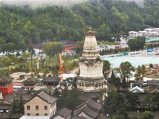 五台山最具标志性的建筑就是大白塔。大白塔就在塔院寺里,高约60米。传说是释迦牟尼舍利塔。佛家讲究“实心实意”,于是这座塔也是实心的。这座白色的高塔,像巨大的白色水瓶矗立于天地之间,又如青色的莲花中间洁白的花蕊。从很远的地方就可以看见它的身影,从远处看,它更像是一头沉睡在大地上的白象的鼻子,尝试着去托住天上的莲座。