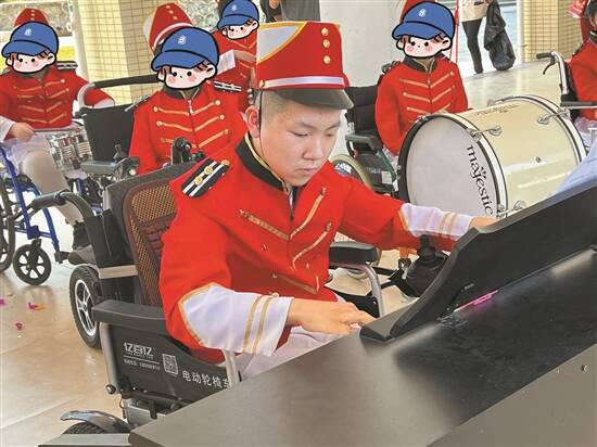 在揭牌仪式上,一支由十余名患有脑瘫的孩子组成的鼓号队表演了《红星闪闪》等曲目,引来观众的阵阵掌声。其中,坐在前排正中间演奏电子琴的学生名叫蔡仙佑,今年15岁,目前就读于广州康复实验学校职业高中一年级。