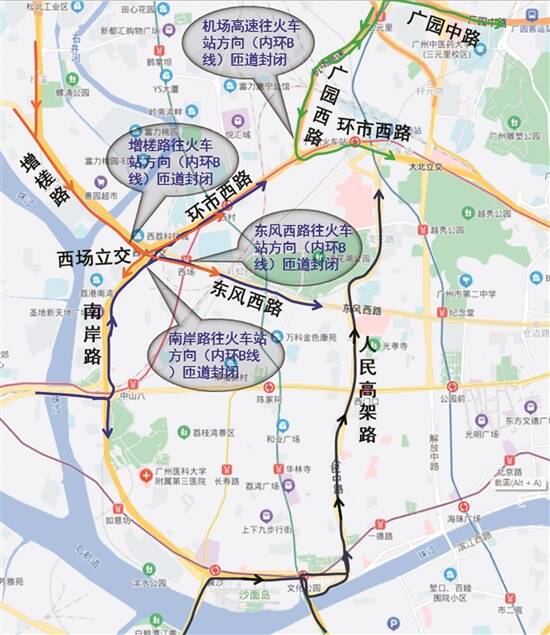 车辆具体绕行线路如下:金沙洲往火车站、广园路方向提前绕行增槎路—东风西路—环市西路;往机场高速方向提前绕行环城高速(北环);机场高速往天河方向提前绕行广园西路或环城高速(北环);南往北往火车站方向提前绕行人民路高架;西往东往天河方向提前绕行东风路。
