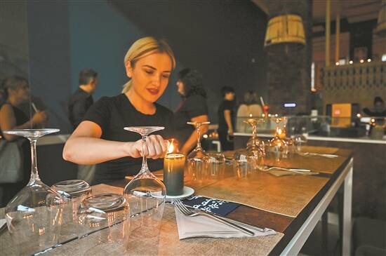 9日,意大利米兰一个餐厅的服务员点起蜡烛。由于能源危机,电费价格也上涨,该餐厅老板为了抗议电费上涨,决定举办烛光晚餐 视觉中国 供图