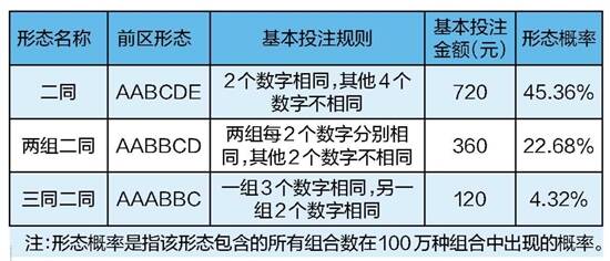 按照重复数字的不同形态,前区全组合投注可分为10种不同的数字形态。其中三同二同、两组二同、二同是本次活动的参与条件,它们都具有较高的形态概率。尤其是二同、两组二同,它们的形态概率是前区全组合投注中最高的两个,是冲击大奖的一大利器。