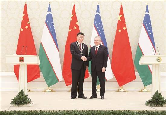 习近平致答辞。习近平指出,米尔济约耶夫总统向我授予“最高友谊”勋章,充分体现出乌方对中乌关系的高度重视,以及乌兹别克斯坦人民对中国人民的深情厚谊。乌兹别克斯坦著名诗人纳沃伊说:“没有比生活在友谊之中更美好的事情。”早在两千多年前,中乌两个伟大民族就以丝绸之路为纽带,互通有无、互学互鉴。30年前,中乌建交,开启了两国人民友好新篇章。两国全面战略伙伴关系实现跨越式发展,各领域合作取得丰硕成果,有力促进了各自发展振兴,也为维护中亚地区乃至世界和平稳定注入了正能量。我和米尔济约耶夫总统商定,深化新时代中乌全面战略伙伴关系,致力于践行中乌命运共同体。中方愿同乌方一道努力,谱写中乌友好新篇章。