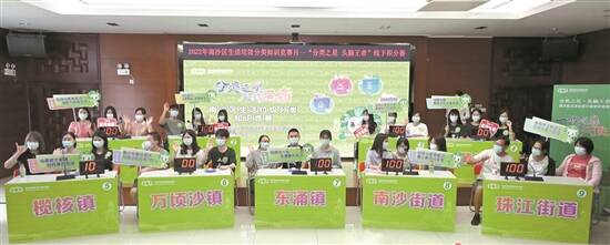 9月15日下午,来自南沙区各镇(街)九个代表队共27名参赛代表齐聚会场,经过初赛和决赛的多轮激烈角逐,最终万顷沙镇以230分的高分斩获大赛一等奖,南沙街道、大岗镇和榄核镇分别荣获二、三等奖和最具凝聚力团队奖,其余队伍获得参与奖。同时,云直播竞赛活动现场,以超高的垃圾分类知识储备水平为广大居民群众提供了一场“视听盛宴”,共有约440位居民群众云参与。