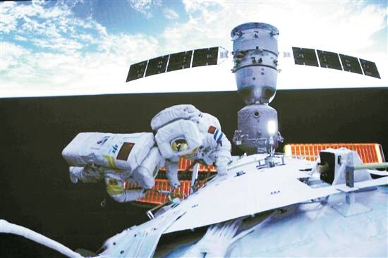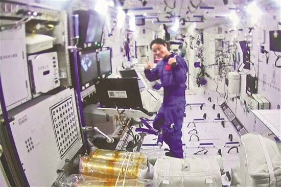 航天员刘洋为圆满完成出舱任务的航天员陈冬、蔡旭哲点赞的画面 图/新华社