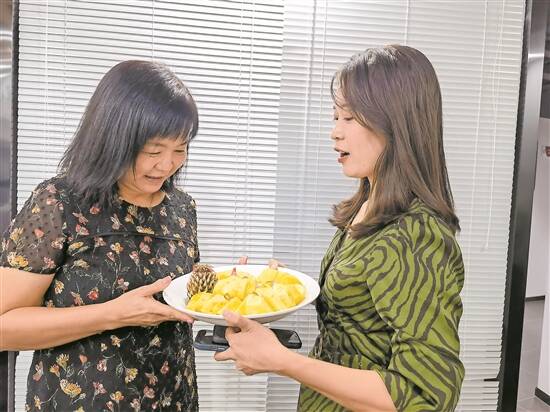 “菠萝妹妹”王小颖(右)特地给黎小军带来新鲜采摘的菠萝