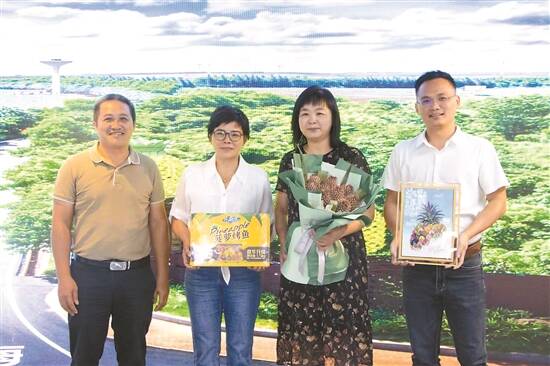 徐闻果农的代表为黎小军(右二)送上菠萝花束、菠萝烤鱼和创意画