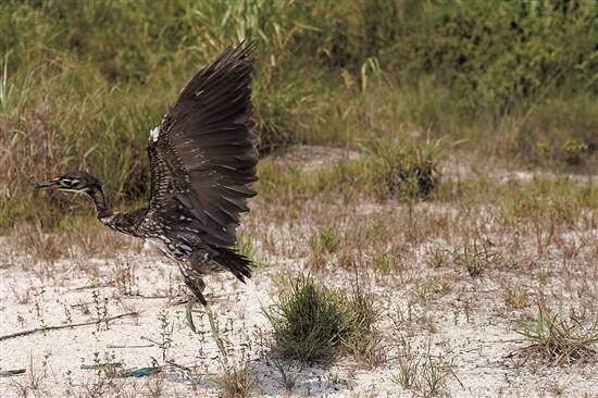 羊城晚报讯 记者黎存根、通讯员邓泳怡报道:日前,在清远银盏水库旁,一只在清远市连山笔架山受伤并被救护的海南虎斑鳽(jiān,音同“兼”)走出静置山林中的笼子,确认环境安全后展翅飞离,回归自然。海南虎斑鳽被称为“世界上最神秘的鸟”,是国家一级保护动物。当天,一同在野外被放归的还包括近期被救护的一只斑头鸺鹠(xiū liú,音同“修留”)和一只白鹭。这是清远市野生动物救护中心成立以来,首批救护动物放归野外。