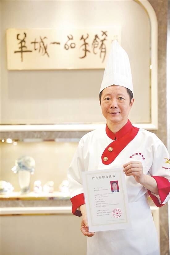 李文平是粤式羊肉煲制作技艺的非遗传承人。他的家族从1910年开始制作羊肉煲,至今已有上百年历史。他沿着厨师道路前行,成长为一名高级技师,2021年获认定为“粤菜师傅”五星级名厨,今年又评上了正高级职称。