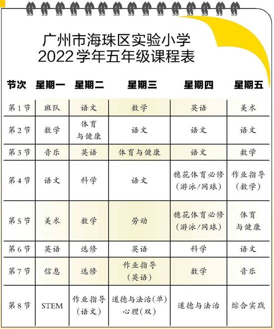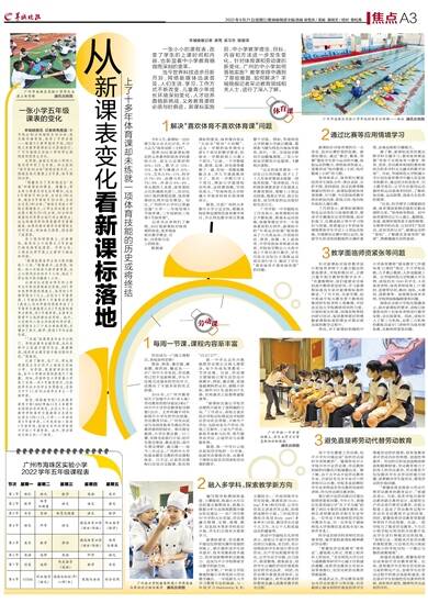记者了解到,在广州,学生课程表发生变化的不止海珠区实验小学。本学期,随着新课标的落地,各中小学都对课程表进行了调整。例如,华南师范大学附属小学除了安排一周4节体育课外,还鼓励学有余力的学生自愿报名,在每天中午11时35分放学后多上一节体育课。