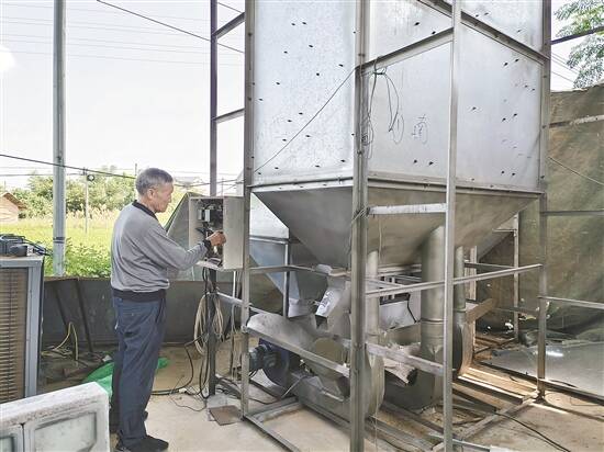 在朱杵养的研发“小工厂”里,记者见到了他最新研制出的空气能谷物热泵烘干机。机器用钢材搭建,高近6米,插上电可以对稻谷进行烘干。