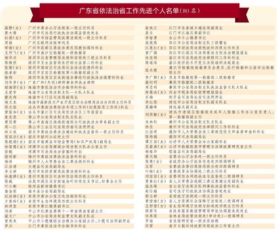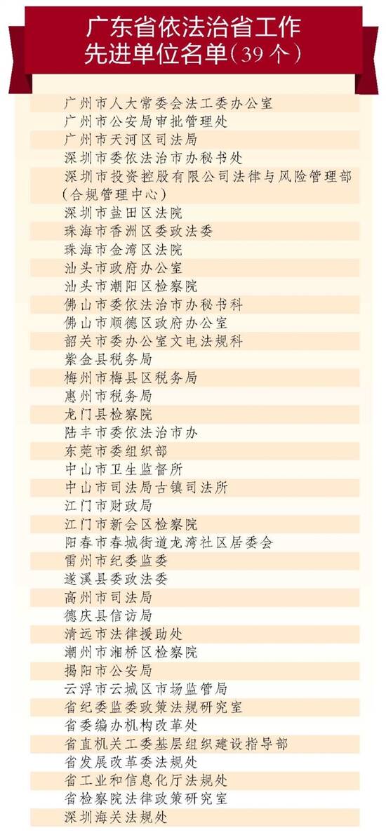 为表彰先进、充分发挥先进典型的示范引领作用,省委决定,授予广州市人大常委会法工委办公室等39个单位“广东省依法治省工作先进单位”称号,授予高静等80人“广东省依法治省工作先进个人”称号。希望受表彰的先进单位和先进个人珍惜荣誉,再接再厉,再创佳绩。