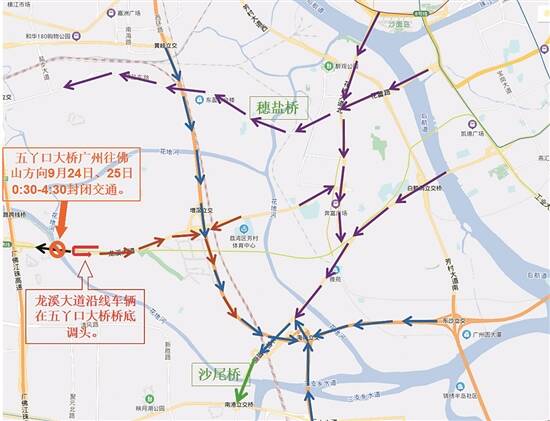 芳村片区以及经珠江隧道、洲头咀隧道、鹤洞大桥原计划经龙溪大道五丫口大桥往佛山方向的车辆,可绕行花地大道南沙尾桥或穗盐路往佛山方向;