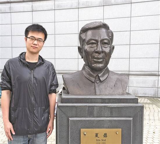 丁雨在温州中学夏鼐铜像前留影