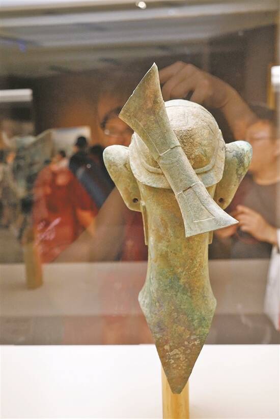 “古蜀华章——四川古代文物菁华”展上,对比展示的三星堆遗址出土的青铜人头像两种不同发型