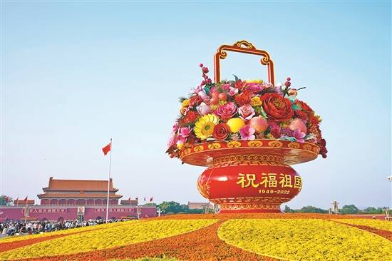 9月25日,“祝福祖国”巨型花果篮亮相北京天安门广场(见图,新华社发)。