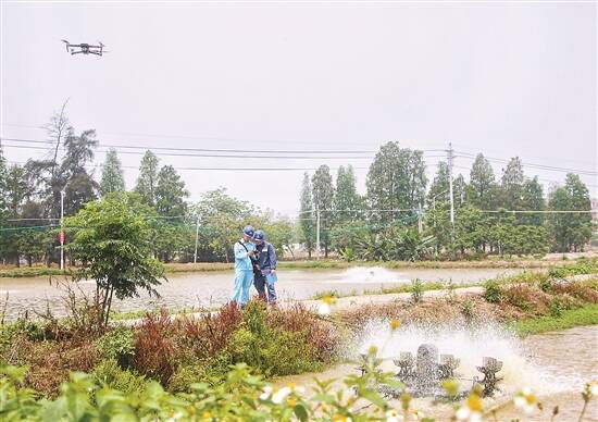 数字赋能电网发展,电力工作人员用无人机巡视鱼塘周边线路设备 (张宇晖 摄)