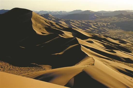 沿着高低起伏的沙脊线徒步,一路相伴的是四壁光滑的大沙坑,犹如刚烧制而成还没上釉的瓷碗。阳光之笔好像挥动的魔杖,将静立的沙山浇灌出一条条光影的褶皱,光与影在精灵般的山脊与山凹之间追逐嬉戏,皱褶或如张开的怀抱,或如滑润的肌肤,或如饱满的美臀,或如性感的厚唇,连人影被拉成一条细长的斜线,所有曲线在不停地翻滚、纠缠,宛若一曲生生不息的牧歌。