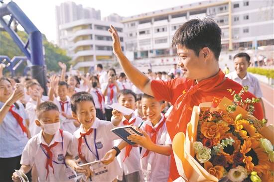“苏神,我是你的铁杆粉丝,我家墙上挂着你亲笔签名的运动服!”9月26日,“亚洲飞人”苏炳添“跑”进华南师范大学附属小学,区田径队比赛中获得100米冠军的张馨月同学对偶像说。这也是“奥运精神传附小,百年校庆续新篇”——庆祝华南师大附小建校100周年系列活动之一。