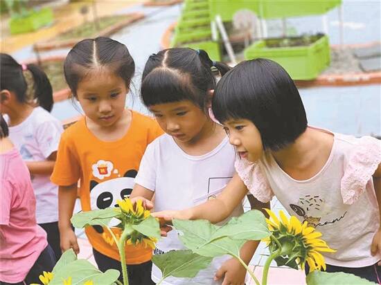 为了让孩子们更好地爱护环境,每一位小朋友从入读小班开始,就要认领一棵树,每天负责给自己认领的树浇水、施肥,观察和陪伴其成长。吕凤清说,孩子们在呵护小树成长的过程中收获是巨大的,他们懂得了植物的多样性,“我们人类也是大自然的一部分,植物有多样性,有不同的种类,人类也一样,有不同的肤色,不一样的性格,大家在一起要和谐共生,这样我们的世界才会更加丰富多彩。”