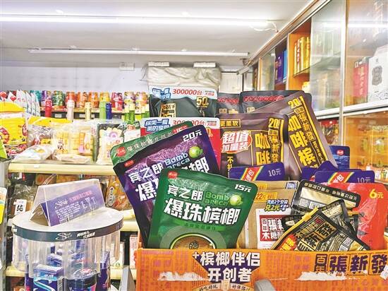 在广州市天河区走访时,记者发现槟榔在穗贩售极为广泛,几乎所有店铺都能见到,且购买不设限制,未成年人也能买。大多商铺都将槟榔摆放在了入口处或收银台旁等显眼位置,某高校内商铺还特地打上了“热卖”的标签。除普通槟榔外,不少店铺内还有枸杞槟榔、咖啡槟榔、爆珠槟榔等多类型、多口味产品出售。