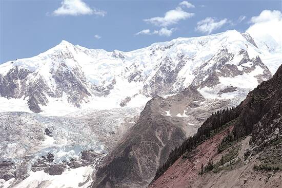 3600米以上,山势更加陡峻,碎石横七竖八,有的悬空欲坠,真叫人提心吊胆。到了3800米以后,地势突然平坦,眼前展现出一片白茫茫的积雪,不少地方被雪水冲袭形成大旋坑。有的积水像小湖泊,有的底部漏水,发出清脆的水声。这里连鸟都很少到,偶尔有一两只鹰在高空中盘旋。