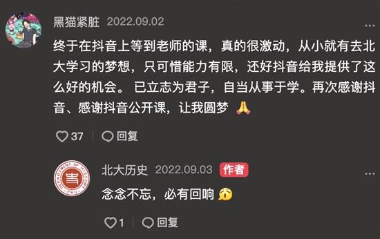 在北大历史系教授阎步克的公开课中,网友@如何安放我 评价:“第一次彻底爱上历史,就是听阎老师的课,一下子就被吸引住了。”网友@黑猫紧脏 表示: “终于在抖音上等到老师的课,真的很激动,从小就有去北大学习的梦想,只可惜能力有限,还好抖音给我提供了这么好的机会。已立志为君子,自当从事于学。”除了阎步克,北京大学教授戴锦华的电影课、中国科学院国家天文台研究员苟利军的天文课、中国科学院物理所研究员曹则贤的物理课……众多学术大咖的公开课都吸引了大批网友的关注。人们从直播课堂中获取的不光是学习的方法论,还有学者们对待学术和人生的态度。网友@汤面片儿 便在苟利军的直播课下评论:“永远爱科学,永远爱梦想,永远向往星辰和大海。”